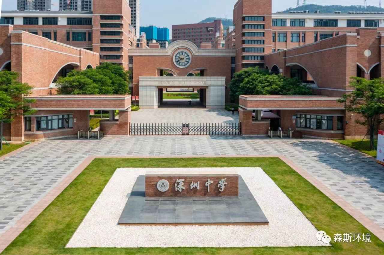本项目位于罗湖泥岗片区,总占地面积为137135平方米。项目在景观布局上最大限度保留原有绿化,采用地面绿化、平台绿化、屋顶绿化相结合的方式,楼四周及部分楼顶天台、停车场地面及预留空地植草种树,建花池等,形成绿意盎然的生态校园景观。笔架山河金湖水库下游明渠段在深圳中学泥岗校区规划红线内穿过,施工中,通过丰富的植物群落配置,打造出校园河道生态景观体验带。建成后的深圳中学(泥岗)校区在有限的场地上,无限放大自然环境,密切了人与自然的接触,让师生在大自然中感悟知识与真实。