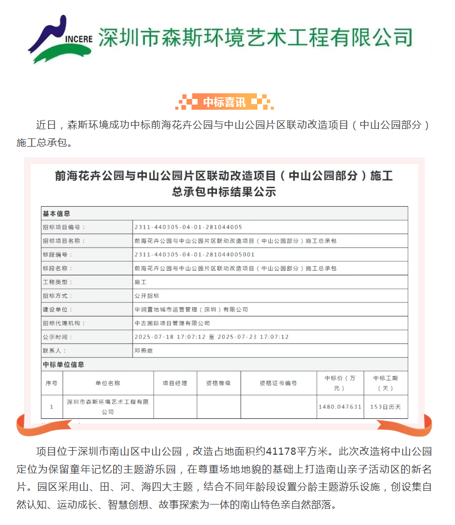 中标喜讯 | 森斯环境中标前海花卉公园与中山公园片区联动改造项目(中山公园部分)施工总承包