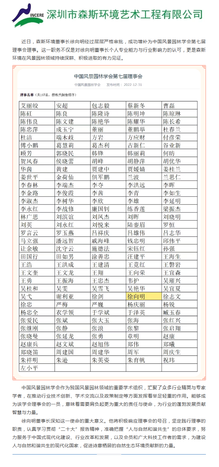 森斯环境董事长徐向明增补为中国风景园林学会第七届理事会理事