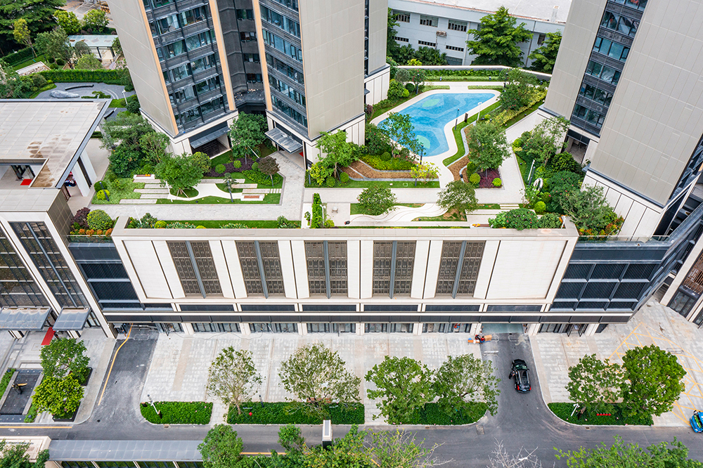 本项目为深铁阅山境小区绿化景观施工项目,位于深圳市南山区,设计风格为现代中式,体现一定的岭南风情。结合适地适树设计原则,主要由大、小乔木、灌木、花草以及地表植被构成。其中乔木包括了紫花风铃木、中国无忧花、丛生丹桂、丛生柚子树、刚竹等,灌木包括大鹤望兰、四季桂、米兰球、银叶金合欢等,花草包括了比利时杜鹃、蓝花鼠尾草、红花文殊兰、金边虎尾兰等。通过各种花草树木搭配,丰富景观层次及色彩,运用群植、团植及孤植的手法,因地制宜地打造不同需求的多元景观,营造春华秋实的园林景观,保证了四季有花,可观花、观果、观叶,给小区住户营造舒适的景观生态环境。儿童活动区域场地开阔,各色橡胶地垫即很好地保护了孩子又能达到眼前一亮的视觉冲击。休闲庭院、景观廊架周围有常绿和落叶乔木各种灌木花卉簇拥而成,在形成一个独立空间之余又能享受到惬意的休闲时光。