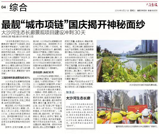 8月20日上午,大沙河生态长廊景观项目建设冲刺三十天誓师动员大会在大沙河西岸大冲公园圆形广场盛大举行,森斯环境作为大沙河生态长廊景观项目绿化工程Ⅳ标段的施工单位,派出大沙河项目部全体施工人员统装参会。会上,项目指挥部发出总攻动员令,要求各参建单位凝心聚力,决战冲刺三十天,确保在9月20日前完成大沙河生态长廊项目的建设任务,并在国庆前全线基本建成并向市民开放,为新中国成立70周年献礼。《蛇口消息报》“04综合”版面对此进行了以“最靓城市‘项链’国庆揭开神秘面纱•大沙河生态长廊景观项目建设冲刺三十天”为题的新闻报道。