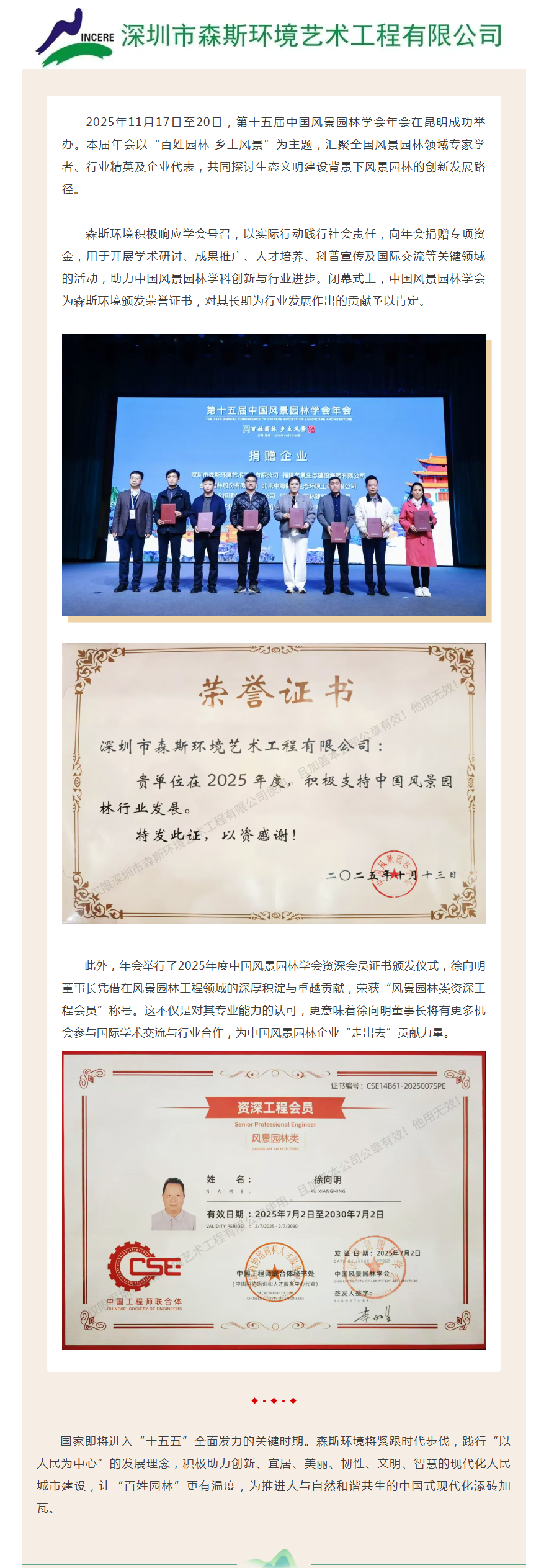 第十五届中国风景园林学会年会在昆明圆满落幕,森斯环境获双重荣誉